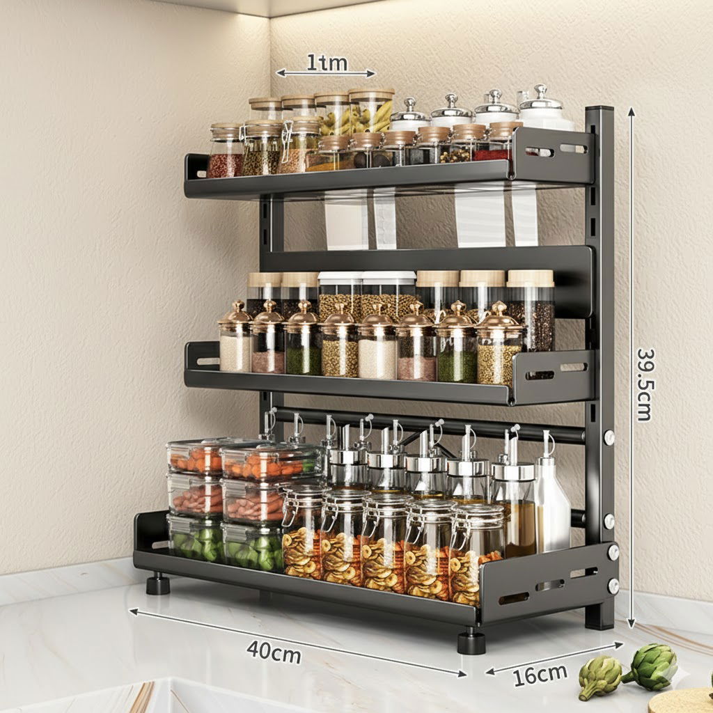¡Maximiza el espacio de tu cocina con estilo y elegancia! Este rack organizador de 3 niveles es la solución perfecta para mantener tus especias, frascos, aceites y cuchillos en un solo lugar, liberando espacio en tu mesada y facilitando tus momentos de cocina.